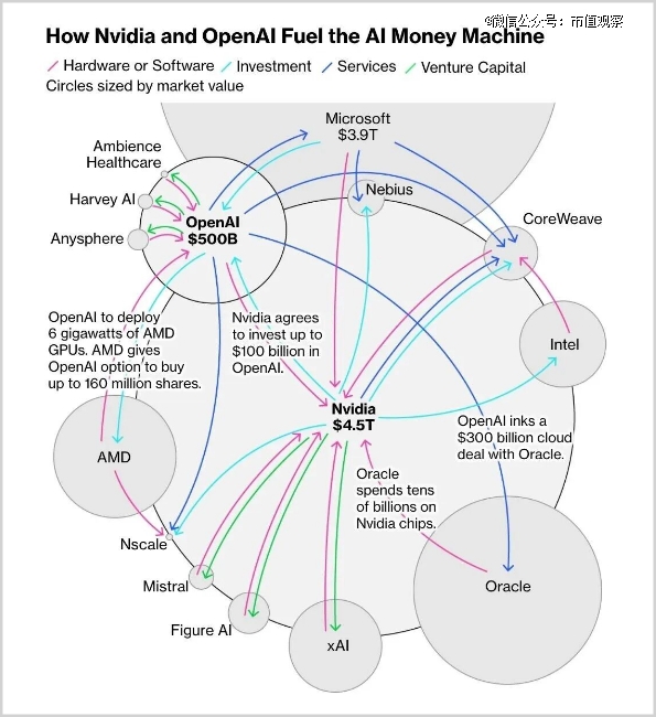 英伟达斥资千亿美元投资OpenAI布局AI系统,OpenAI转而将千亿美元投入甲骨文购买云计算服务,甲骨文又转身向英伟达采购千亿美元芯片。